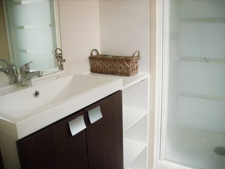 Recente stacaravan met airconditioning en een woonkamer (bank om te bouwen tot bed voor 2 personen). Schaduwrijk terras met tuinmeubilair.