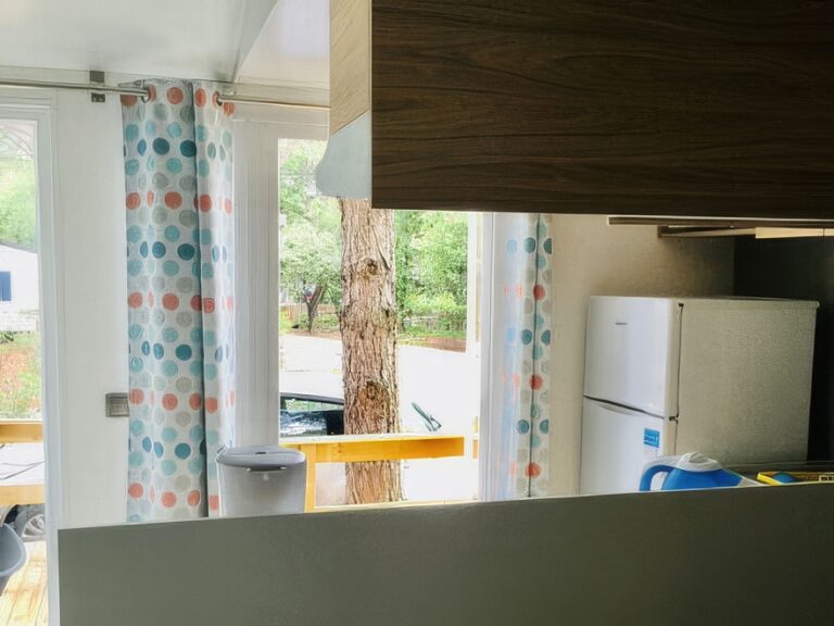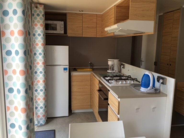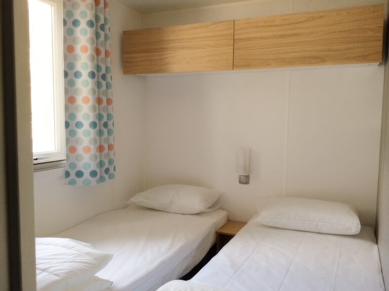 OHARA Model 1064. Groot, ruim, 3 slaapkamers, 2 badkamers. Stacaravan gelegen op een schaduwrijke plek tussen de pijnbomen. Franse deuren leiden rechtstreeks naar een groot terras met gesloten deur. Half schaduw, half zon. Prachtige locatie om te profiteren van alle campinginfrastructuur.
