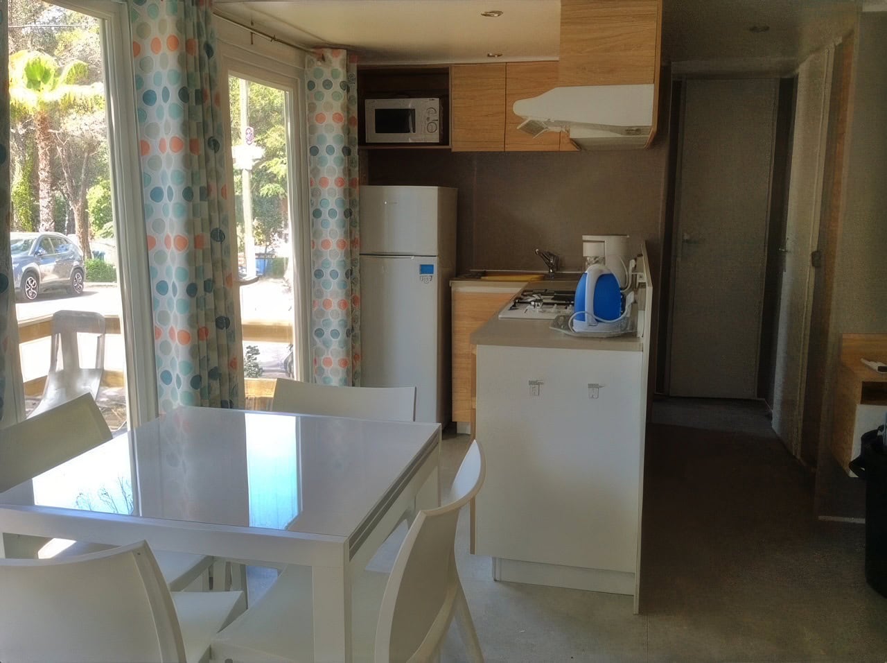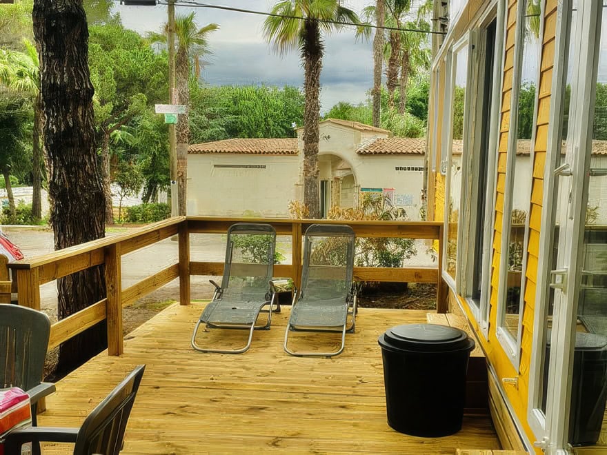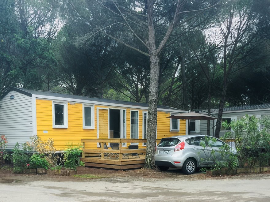 OHARA Model 1064. Groot, ruim, 3 slaapkamers, 2 badkamers. Stacaravan gelegen op een schaduwrijke plek tussen de pijnbomen. Franse deuren leiden rechtstreeks naar een groot terras met gesloten deur. Half schaduw, half zon. Prachtige locatie om te profiteren van alle campinginfrastructuur.