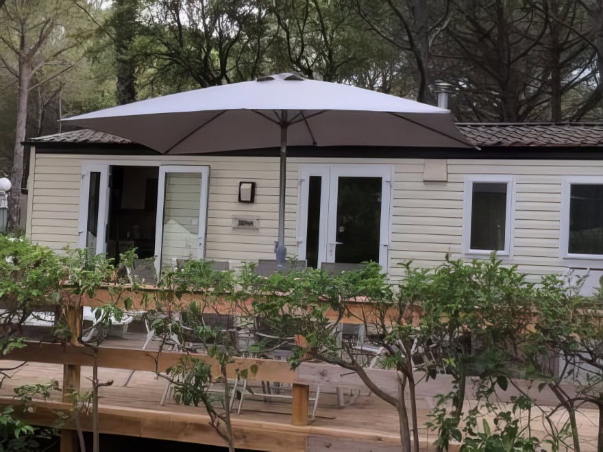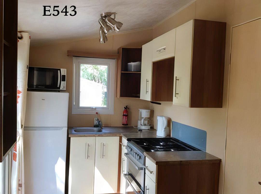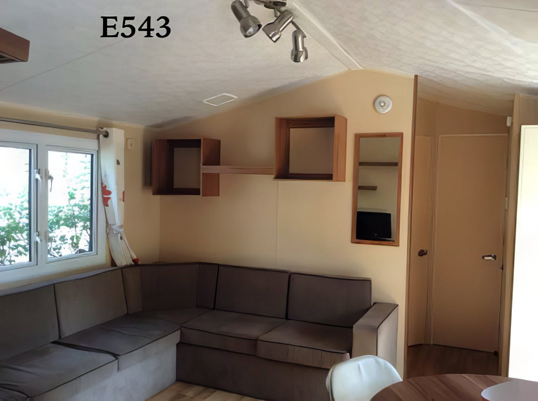 Op een hoek gelegen stacaravan met 2 slaapkamers, 1 badkamer en een ingerichte keuken die direct uitkomt op het houten terras. Luiken voor slaapkamerramen. Gelegen nabij het Palmeraie-complex.