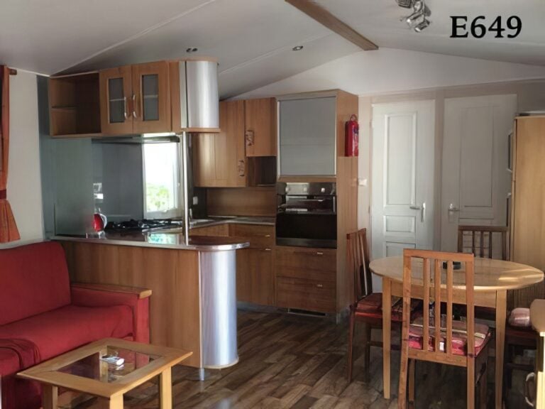 Mooie voorzieningen, stacaravan met 2 slaapkamers, waarvan één met kleedkamer, 1 badkamer. Woonkamer met een prettige slaapbank. Groot houten terras omgeven door een balkon.