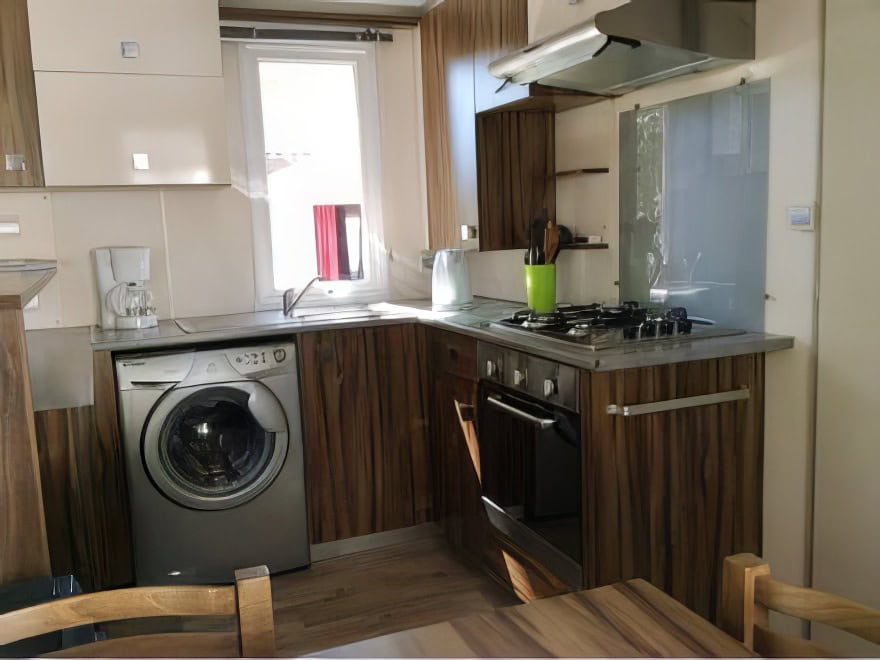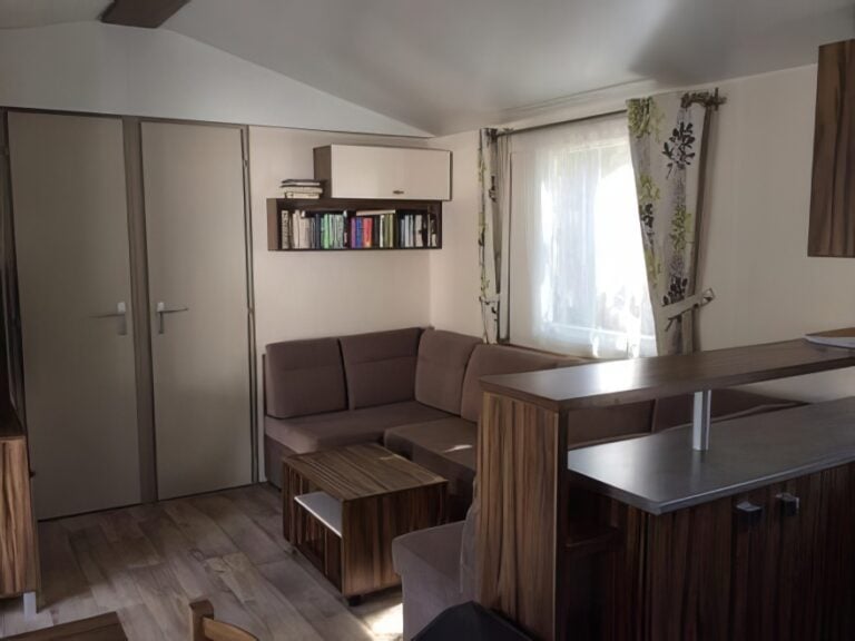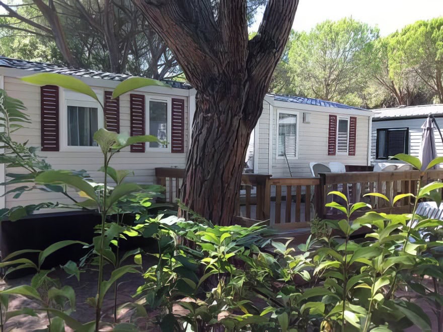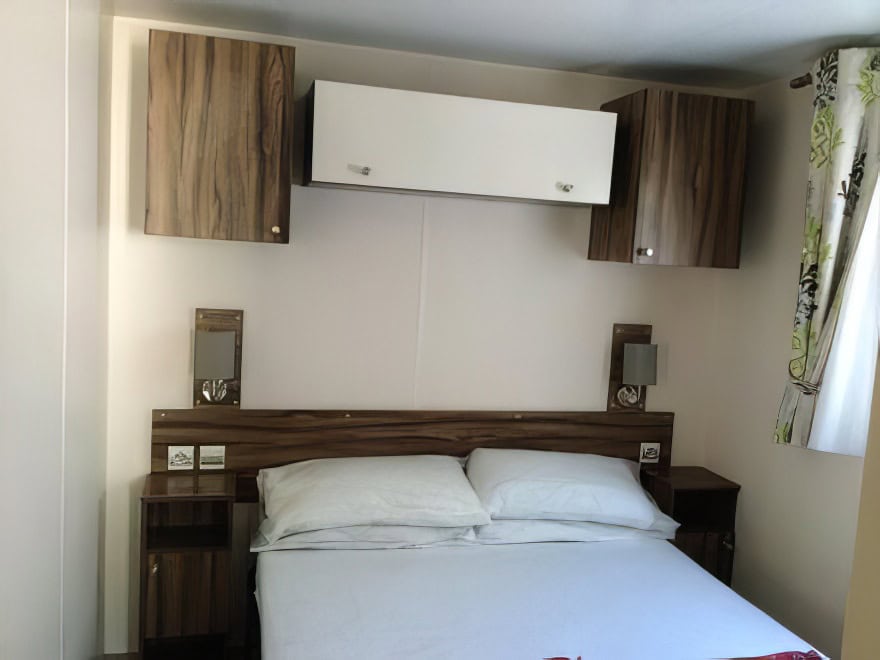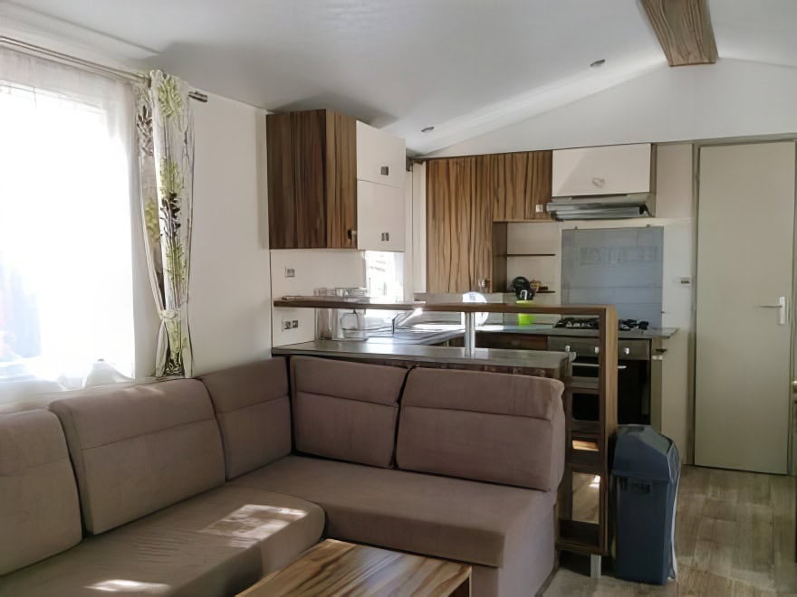 Grote stacaravan met 3 slaapkamers en 1 badkamer gelegen op een zeer ruime locatie, midden op de camping. Luiken voor slaapkamerramen. Groot houten terras met gesloten balkon, ideaal voor kinderen.