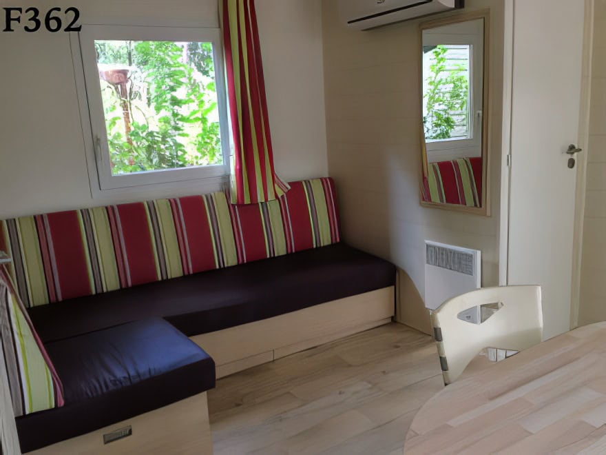 Charmante stacaravan met 2 slaapkamers en 1 badkamer met een keuken die direct uitkomt op het houten terras. Gelegen in een doodlopende straat.