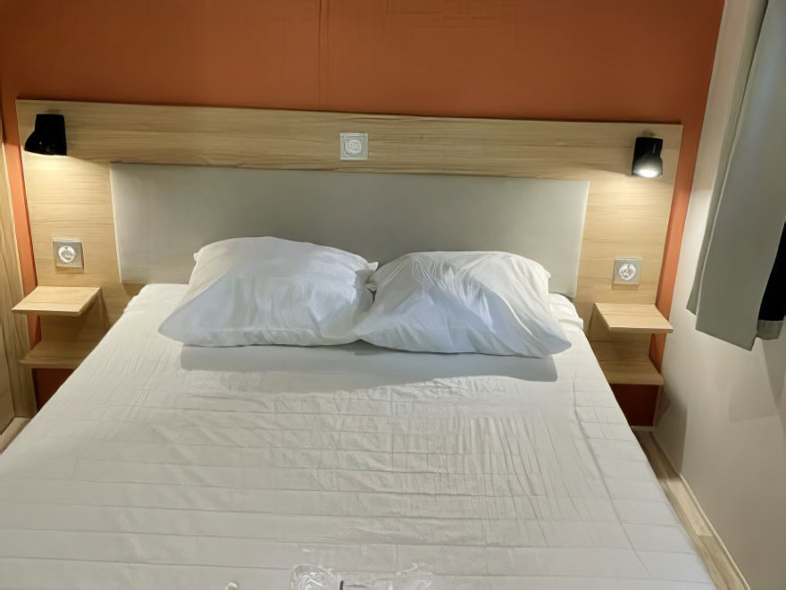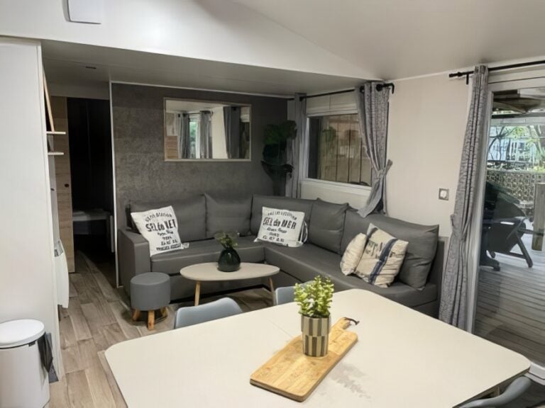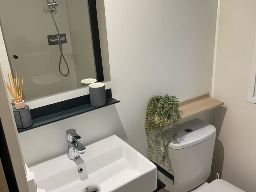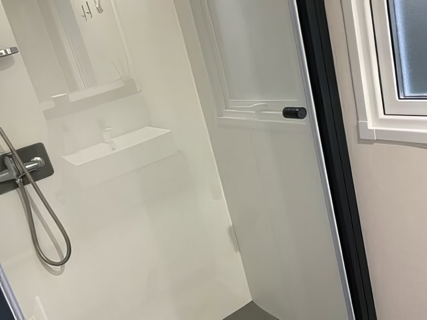 Schitterende nieuwe stacaravan op een grote schaduwrijke plaats.