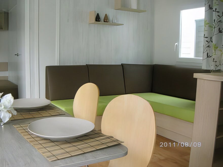 Zeer aangename, lichte stacaravan met drie slaapkamers en luiken voor de ramen (een tweepersoonsbed, vier eenpersoonsbedden). 1 badkamer, een keuken uitgerust met een oven, een zeer lichte woonkamer (TV, DVD en Franse zenders) die uitkomt op een groot houten terras en een bosrijke tuin met eigen parkeerplaats. Wasmachine en extra koelkast voor altijd koude dranken. Gelegen nabij de zwembaden en sportcomplexen van Palmeraie.